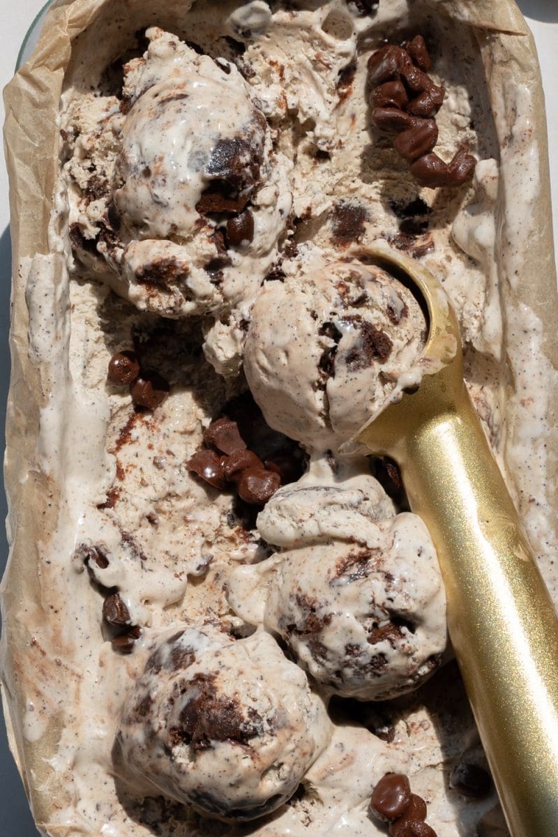 Pour the ice cream into your prepared loaf pan and top it with additional brownie bits and regular espresso beans (if desired.) Cover the pan with plastic wrap and place it in the freezer to freeze for at least 4 hours, ideally overnight.