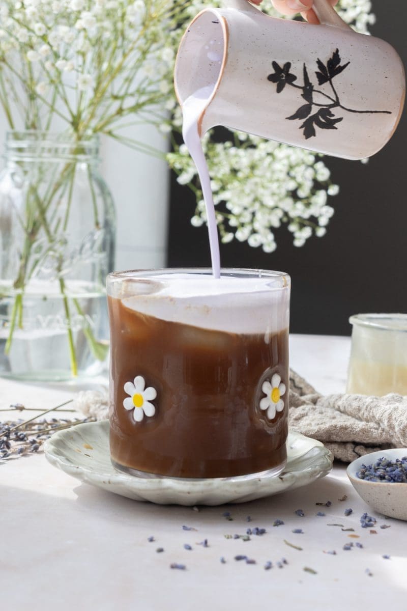 Once you're ready to make your drink, add the heavy cream, milk, and 1 tbsp. of the lavender sauce to a medium sized cup or container. If desired, add in some purple food coloring as well. Froth or shake the mixture until it's thick and foamy.